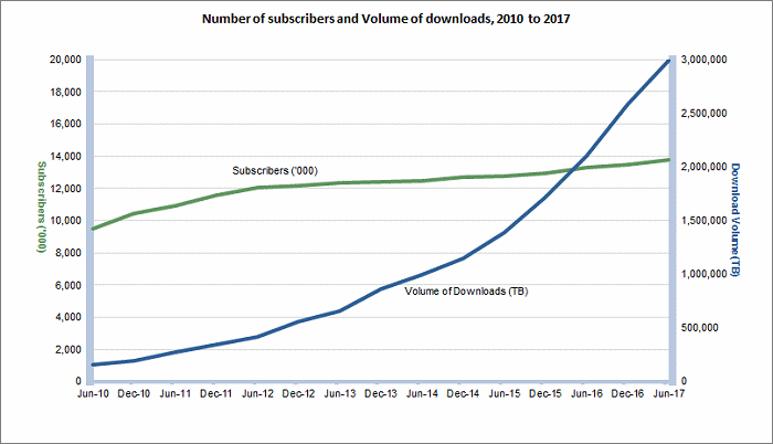 The amount of data downloaded by Australians has been dramatically increasing. ABS reports the total volume in the three months ended 30 June 2017 was 3.0 million Terabytes (3.0 Exabytes). This was 15.8% more compared to the three months ended 31 December last year and a 42.8% increase in data downloads in the year between June 2016 and June 2017.