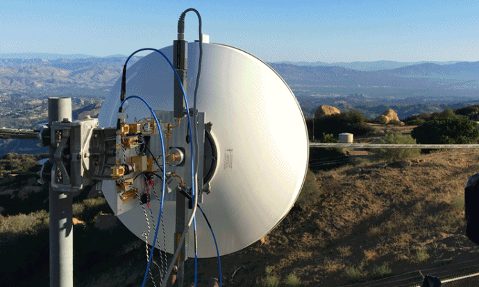 The image above shows the transmitter; which uses custom-built MMW components attached to a commercial 2ft diameter parabolic antenna; installed in Southern California. The transmission used a bandwidth of 2 GHz, and according to the researchers, resulted in an overall spectral efficiency of 9.8 bits per second per Hertz.